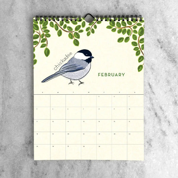 A 12-month wall calendar illustrated with colorful illustrations of birds such as the bluebird, chickadee and cardinal. Dates displayed in a grid format.