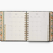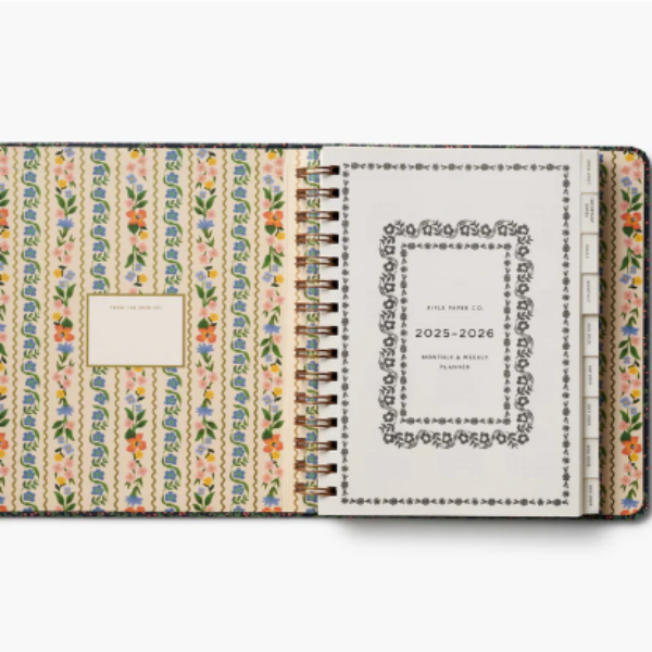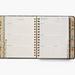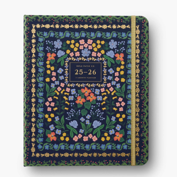 Start planning ahead with our 17-month planner. A sturdy hard cover with gold accents wraps over an interior spiral binding, and a metallic band holds the pages closed. Inside you’ll find monthly and weekly views, inspirational quotes, sections for notes and goals, an illustrated pocket folder, and 2 pages of stickers. Planners span August 2025-December 2026.