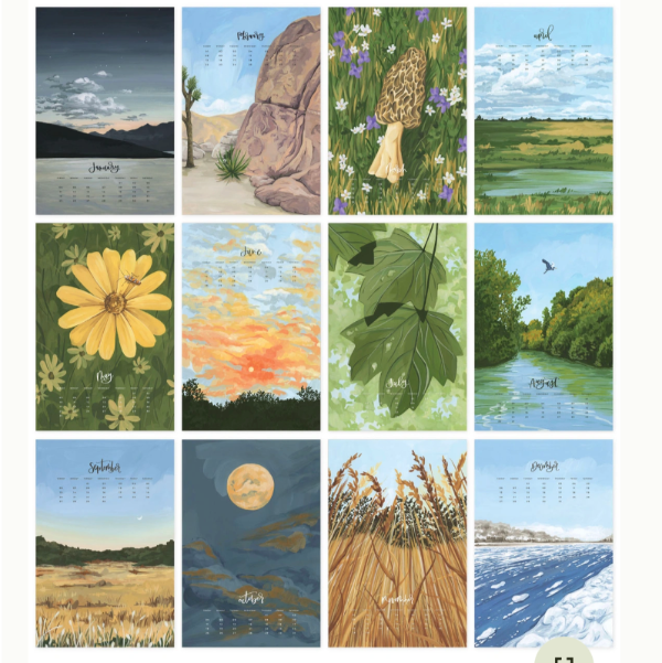 Celebrate the beauty of each season with the Natural World 2026 XL Calendar. Featuring twelve hand-painted scenes inspired by nature’s quiet wonders—like morel mushrooms, golden fields, snowy rivers, and blooming wildflowers—this oversized calendar brings a peaceful touch to any wall. Printed on six double-sided 20” x 30” sheets, it’s perfect for home offices, classrooms, studios, or nature-lovers who want a monthly view with a scenic twist. Great for gifting to hikers, gardeners, and anyone who finds joy in the outdoors. A functional art piece that keeps you grounded all year long.