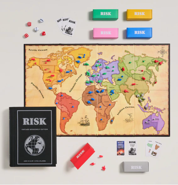 This collectible, fabric-wrapped book was inspired by the 1993 edition, which first introduced the variation of SECRET MISSION RISK. This includes special cards giving each player a specific “mission” to complete in order to win the game. The stylish bookshelf package offers a convenient storage solution that doubles as smart decor.
