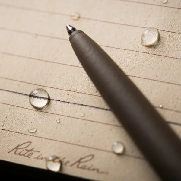 The Rite in the Rain All-Weather Flat Dark Earth Metal Clicker Pen powers through weather and messes. The powder-coated brass barrel contains a pressurized ink cartridge that writes upside down and through moisture. The ink cartridge performs in temperatures from -30F to 250F and the ink won't leak, evaporate or blow up in your pocket. A tight, durable clip clings to your shirt or pocket when the going gets rough. The perfect everyday carry pen, it's ready to write at all times in any weather.