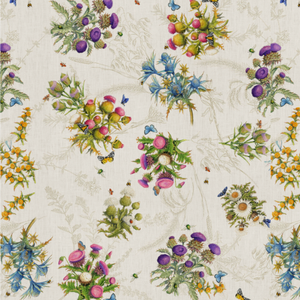 Cynar is an elegant tablecloth printed on soft bleached linen that enhances the beauty and meticulous details of "minor" nature. Thistles and wild artichokes that grow on the edges of fields and paths were designed by our artist with meticulous precision to capture their rustic beauty. An invitation to pause to capture the essence of the nature that surrounds us.