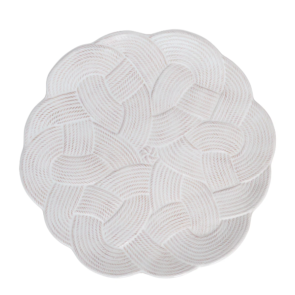 Symbolizing protection, love, and a long, happy life, the mystic knot has been cherished for generations by sailors as a tribute to their families and the sea. With its interwoven braided whorls in a milky whitewash finish, this large charger delivers a rich textural warmth, sculptural silhouette and timeless aesthetic to the table for layering with other patterns or to use as a beautiful serving platter.