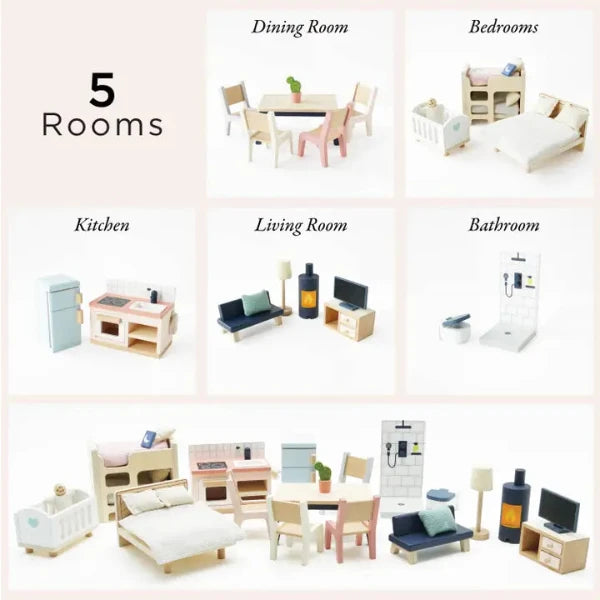 Furnish your miniature play universe with this stunning 35-piece furniture set. Ready to dress any dream home, moving in day has never looked so good. Featuring natural soft tones and lots of exposed wood, add instant style to your little ones dolls house with this amazing starter set which includes a kitchen, a living room with a log burner, a bedroom with a double bed, bunk beds and a cot, a shower room, plus a dining table and chairs and lots more! Compatible with all our dolls, dolls houses and accessories.