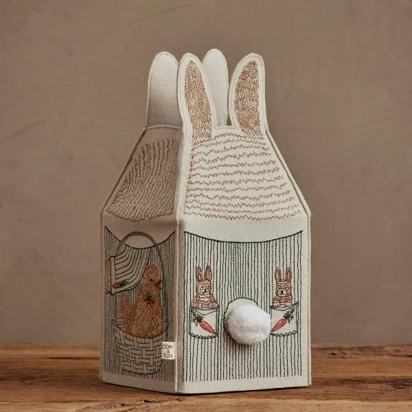 Decorate your tissue box cover with our Bunny design. Felt bunny ears disguise the tissues, and every side is embroidered with great detail. Find stitched carrot buttons, baby chicks, and a duckling, sweet stripes, and a pom-pom bunny tail. A unique decorative item for Easter, children’s rooms, and more.