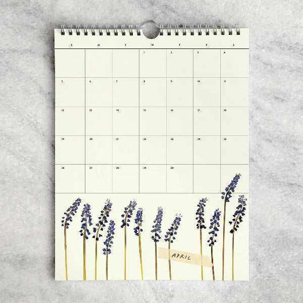 A 12-month wall calendar beautifully illustrated with pressed flowers. Dates displayed in a grid format.
