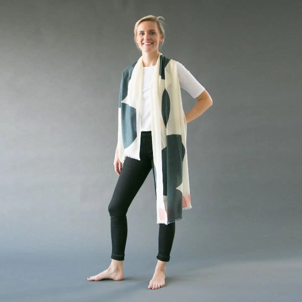 Boulder is a respectful nod to esteemed British artist Barbara Hepworth, a love for well-worn river pebbles and rocks. A personal passion for color play on a divine large functional scale. These are soft luxurious scarves. They are seasonless wraps perfect for cool summer evenings adding warmth and a stylish layer for your neck and shoulders, either over or under a coat in the cooler months. Individually handwoven and hand-silkscreened in Kathmandu Nepal, these scarves are wonderfully soft and warm to the touch. The fine weave allows the color to show through both sides a cloud against your skin.