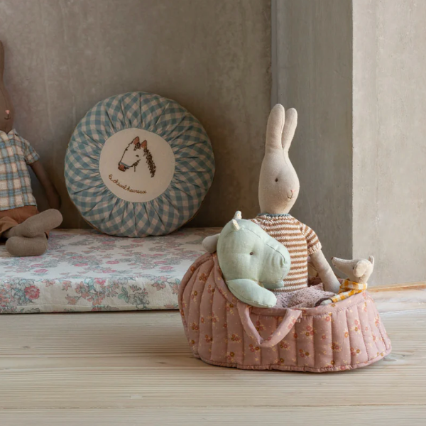 A small portable bed for your soft friends - Bunny plush and small Safari friends fit perfectly. With this carry cot, it is easy to bring along your friend. Your friend will sleep tight with the soft pillow and under the warm knitted blanket.