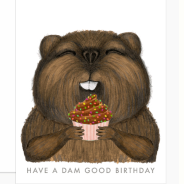 Beaver about to devour a cupcake with text that reads "Have a Dam Good Birthday".