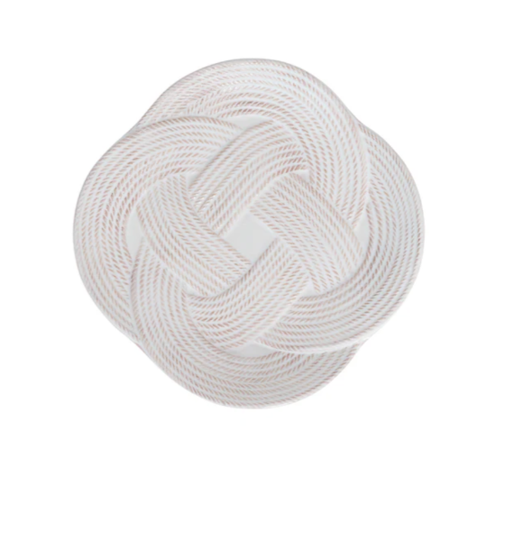 Symbolizing protection, love, and a long, happy life, the mystic knot has been cherished for generations by sailors as a tribute to their families and the sea. With its interwoven braided whorls in a milky whitewash finish, this dessert/salad plate brings rich textural warmth, a sculptural silhouette and a timeless aesthetic to any table setting.