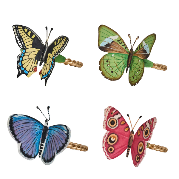 Add a touch of whimsy and color to your table with this set of intricately hand-sculpted and painted metal butterfly napkin rings that are tiny works of art—capturing spring in full flight—and setting your linens a-flutter with charm and delight. May the oohs and aahs commence!
