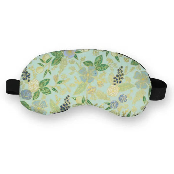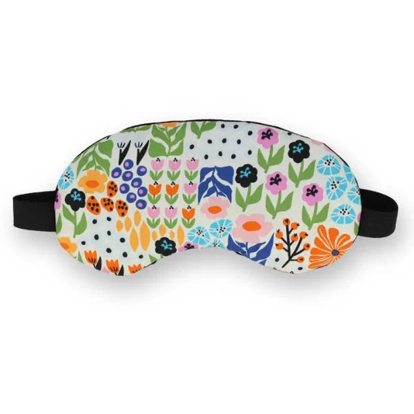 Cheerful cotton print sleeping eye mask with a soft black flannel backing, elastic strap, and adjustable velcro closure for a comfortable, customizable fit.