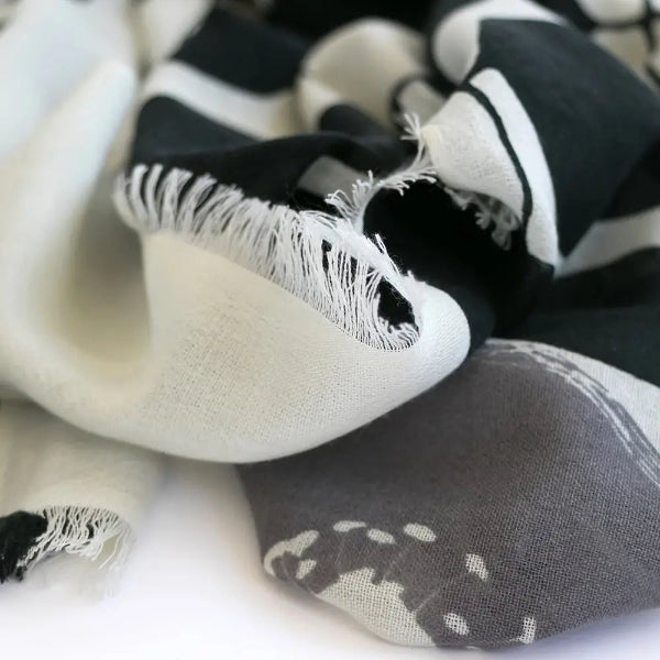 These limited-run season-less scarves are perfect for cool summer evenings adding warmth and a stylish layer for your neck and shoulders, either over or under a coat in the cooler months. Our scarves are ideal for summertime weddings. Until is a rhythmic jazzy design inspired by a leafy unknown plant in my garden with long thorns on the stems and beautifully spaced rounded foliage. Melodic leaves and blooms on heavenly soft. Individually handwoven and hand-silkscreened in Kathmandu Nepal our scarves are wonderfully soft and warm. The fine weave allows the color to show through both sides. A cloud against your skin.